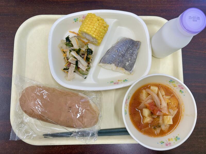 コッペパン、牛乳、白身魚のムニエル、大根の海藻サラダ、産山村のスイートコーン、