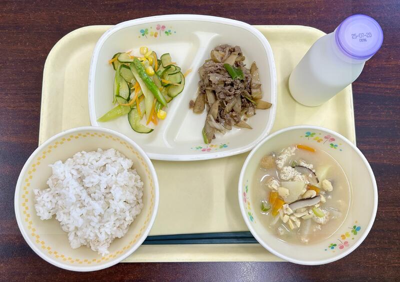 ごはん、牛乳、ピーマンの肉詰め、星のチーズサラダ、魚そうめん汁、七夕ゼリーです。