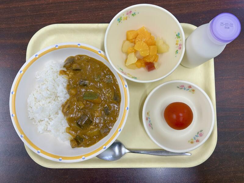 夏野菜カレーライス、牛乳、フルーツポンチ、無農薬ミディトマトです。