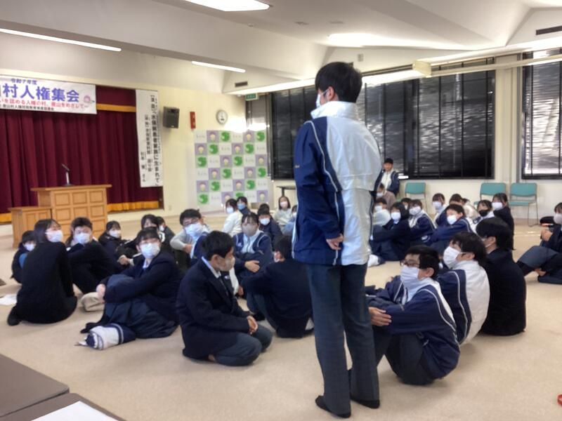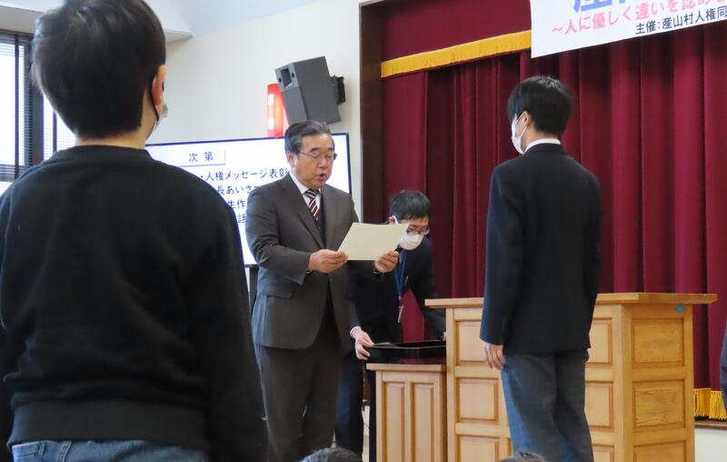 まず、村が募集した「人権メッセージ・標語」の優秀作品の表彰が行われました。本学園から学年1名ずつの9名が選出されました。9名は名前を呼ばれ、その場に起立しています☆