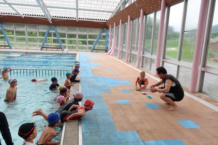 水に顔をつけたり、リレーをしたり、フロートにつかまってクロールにつながる動きを練習したりしていました。