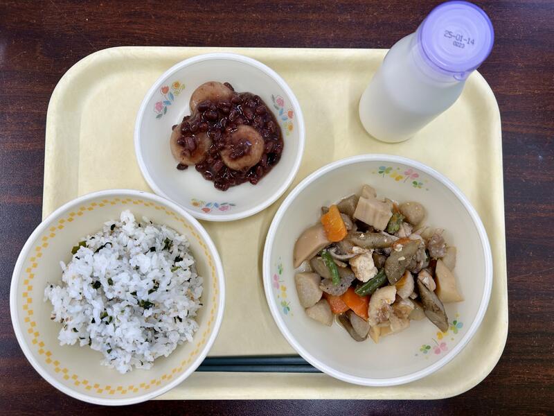 わかめごはん、牛乳、がめ煮、ミニぜんざいです。