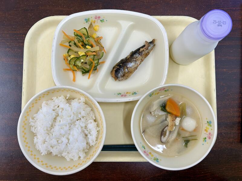 ごはん、牛乳、さばのみそ煮、ほうれん草の白あえ、鶏ごぼう汁です。