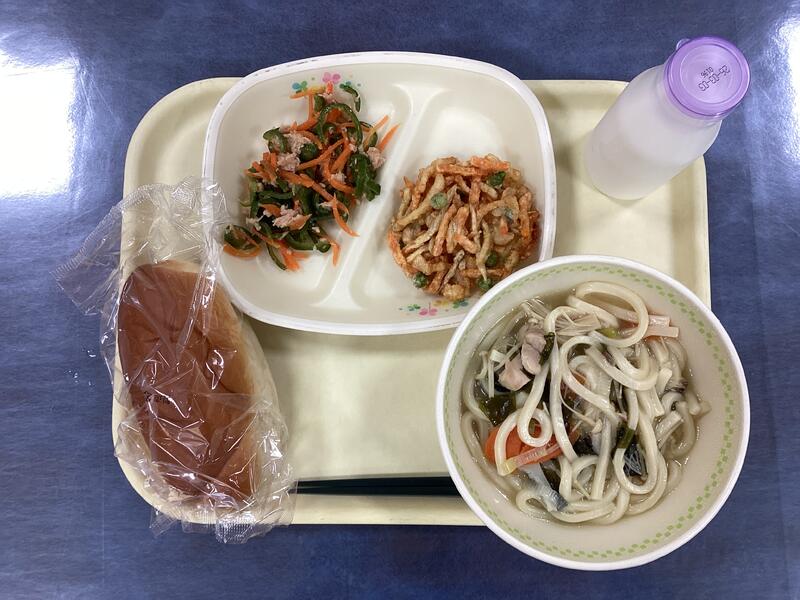 ミルクパン、牛乳、野菜かきあげうどん、ピーマンのツナあえ です。