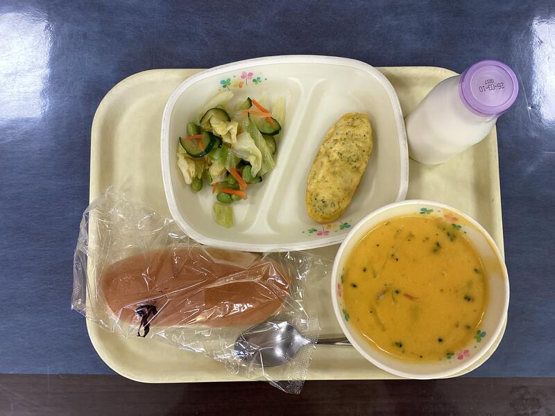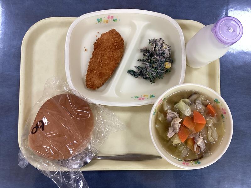 丸パン(カット)、牛乳、サーモンチーズフライ、ひじきと鉄分のほうれん(産山食材)草サラダ、コンソメスープ
