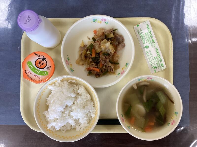 ごはん、牛乳、ホイコーロー、トックスープ、フルーツムース です。