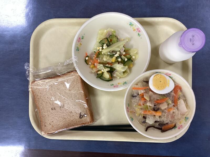 黒糖パン、牛乳、タイピーエン(ゆで卵つき)、カルシウムサラダ です。
