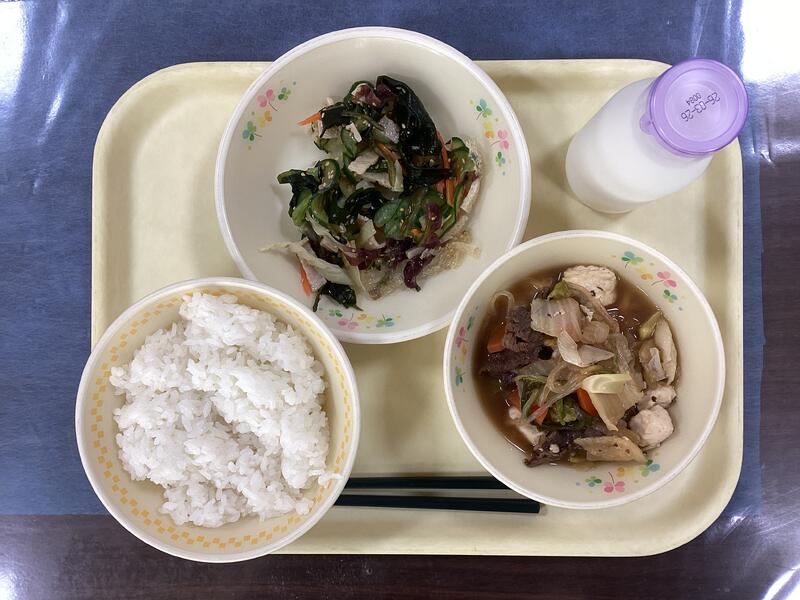 ごはん、牛乳、うぶやま牛肉の肉豆腐、海藻サラダ です。