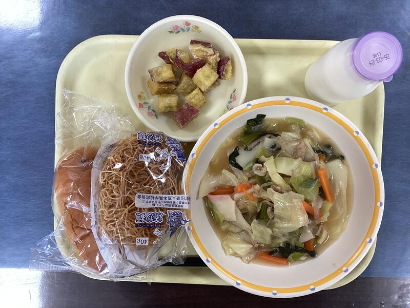 ミルクパン、牛乳、パリパリ焼きそば、キャラメルポテト です。