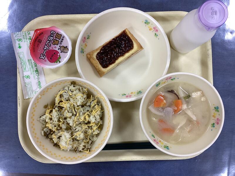 高菜ごはん、牛乳、厚揚げの田楽、だご汁、豆乳いちごムース です。