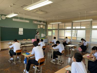 手指の消毒、マスク、2年生をA、B2つに分けての授業。3蜜を避けた武道場(多目的室)とミーティングルームの利用等、