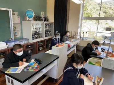 始めに10問テストを行っていました。溶媒、状態変化、アルカリ性、実像、斑状組織、浮力、柱頭、震央、被子植物、石英という2年生で習ったことの復習テストでした。2年生は反応が良く、テンポの良いリズムで説明が行われていました。