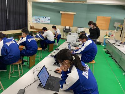 5時間かけて、「職業調べ」をしています。一人一台のタブレットPCをうまく活用している様子です。生徒たちは、自分の興味がある職業について調べ、仕事内容、平均年収、必要な資格や免許、主な進路などについてまとめていました。