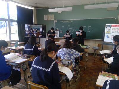 1年生が頑張って、英語の教科書の音読を練習したり、発表したりしている様子です。