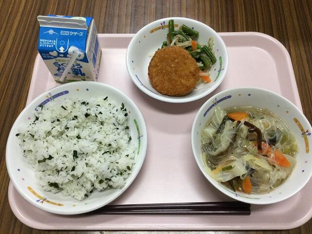 そして、今日の「かみかみ食材」は「茎わかめ」でした。茎わかめは、わかめの中心にある芯の部分です。コリコリとした歯ごたえが特徴的ですね。茎わかめには、お腹の調子を整えてくれる食物繊維がたっぷりで、カロリーもとても低いので、美容にも良いと言われている食品です。今日は、スープで美味しくいただきました。