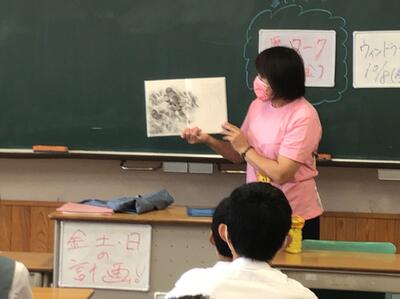 おひさまタイム 投稿日時 : 2021/10/08 校長 山江村で絵本の読み聞かせを行われている「おひさまの会」が来校され、朝の時間を使い、各クラスで絵本の読み見聞かせがありました。 1-1は「すみれ島」、「1-2はちいちゃんのがげおくり」2-1は「ちっちゃいこえ」、2-2は「わたしのヒロシマ」3-1は「クリぞう」を題材として語っていただきました。 今回のテーマは「平和」です。 会の方々からの心のこもった語りに、すべての生徒が真剣に聞き入っていました。 Tweet