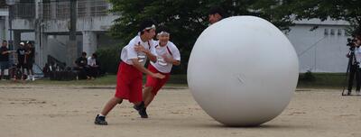 体育大会 大玉転がし 「進撃の巨玉(きょたま)」 投稿日時 : 05/23 校長 今回の体育大会では、小学校の運動会でお馴染みの種目を2種目行いました。 その一つが「大玉転がし」テーマは「進撃の巨玉(きょたま)」。 「集中力」と「チームワーク」、「団結力」そして「運」が求められます。 両団、「位置につきました!」・・・緊張の一瞬!!!! 中には、大玉が早すぎて・・・ 跳ねて・・・ 折り返し 交代は、チームの頭上で大玉を送って・・・ 同じように・・・ ゴールしました。 青団の勝ち!! 「ばんざ~い ばんざ~い ばんざ~い!」 Tweet