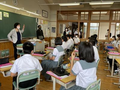 公開した授業は1年生の少人数学習(2クラスに分かれての授業)の様子です。両クラスともに英語科担当の教諭とALTのペアで、ICT機器もフルに活用される授業でした。子供たちも普段通りに活発な発表やコミュニケーションの活動が行われていました。