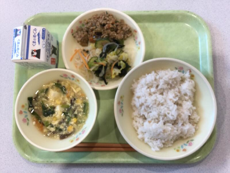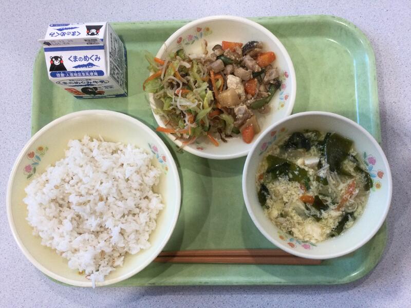主食(麦ごはん)、牛乳、副食(鶏肉と厚揚げの中華煮、きくらげの中華和え、かきたま汁) |