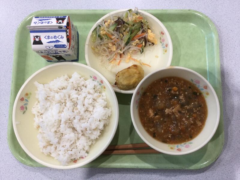 主食(麦ごはん)、牛乳、副食(麻婆豆腐、バンサンスー、ヨーグルト) |