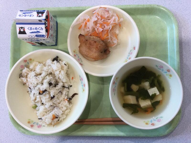 主食(わかめごはん)、牛乳、副食(鉄火煮、ひじきサラダ、りんご) |