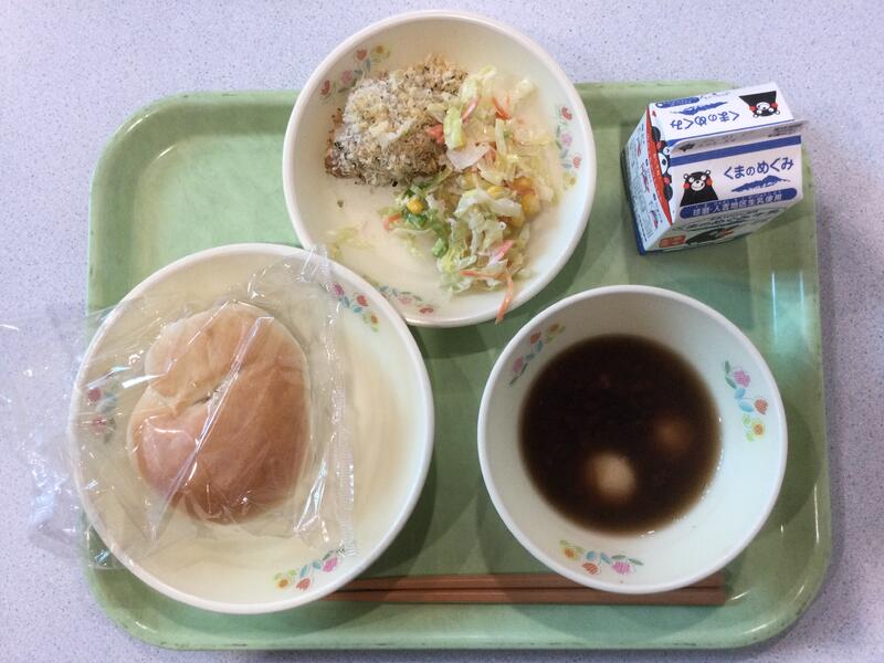 主食(米粉パン)、牛乳、副食(鶏肉のパン粉焼き、コールスローサラダ、ぜんざい) |