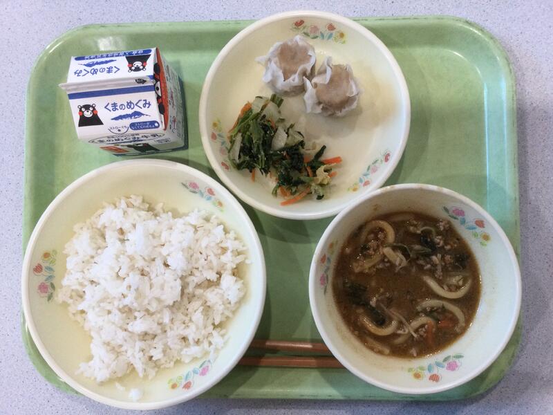 主食(麦ごはん)、牛乳、副食(シュウマイ、ほうれん草のごま酢あえ、担々うどん) |