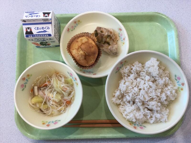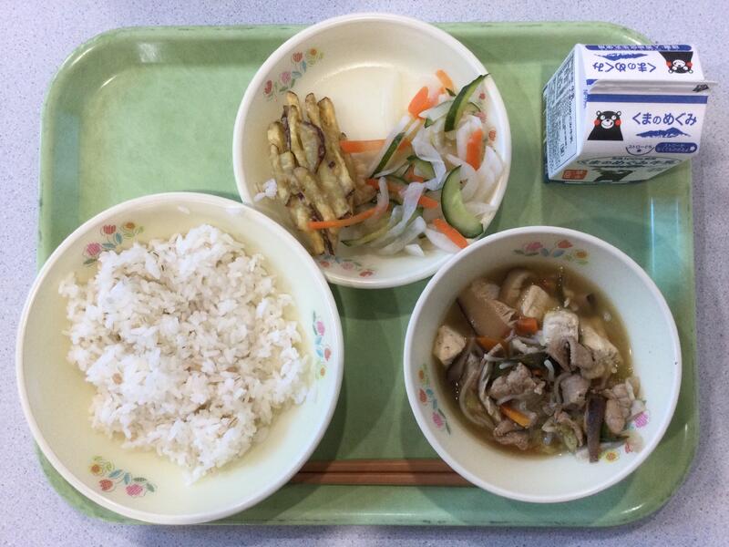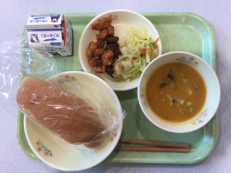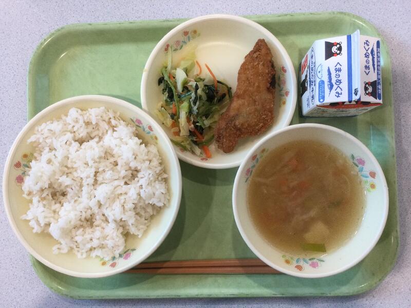 主食(麦ごはん)、牛乳、副食(とり肉の竜田揚げ、キャベツの甘酢和え、里芋のみそ汁) |