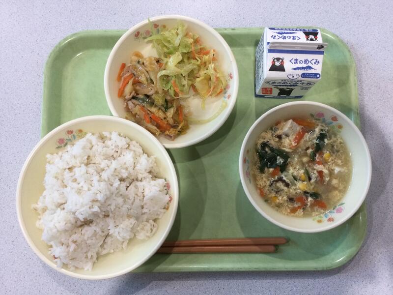 主食(麦ごはん)、牛乳、副食(豚キムチ炒め、野菜の酢みそあえ、コーンと卵のスープ) |