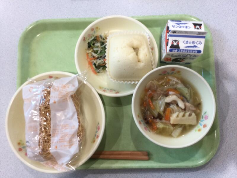 主食(手作り肉まん)、牛乳、副食(皿うどん、皿うどん) |