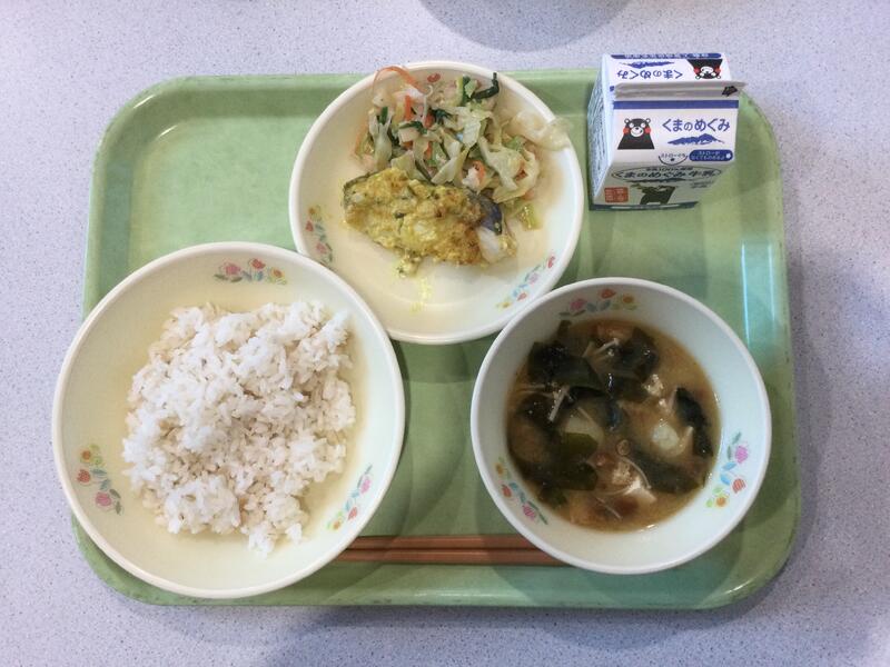 主食(麦ごはん)、牛乳、副食(魚のカレーマヨネーズ焼き、れんこんのごまサラダ、れんこんのごまサラダ) |