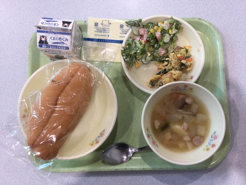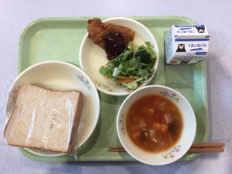 主食(黒糖パン)、牛乳、副食(ザクザクチキン、カラフルサラダ、ミネストローネ) |