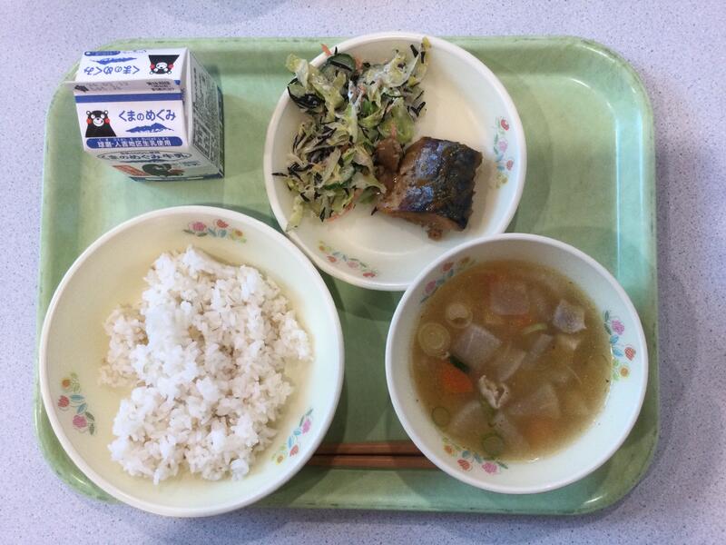 主食(麦ごはん)、牛乳、副食(さばのみそ煮 、ひじきサラダ、お姫さんだんご汁) |