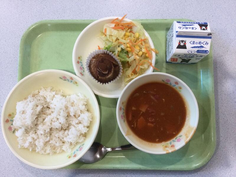 主食(コッペパン)、牛乳、副食(チリコンカーン、コブサラダ、カボチャのポタージュ) |
