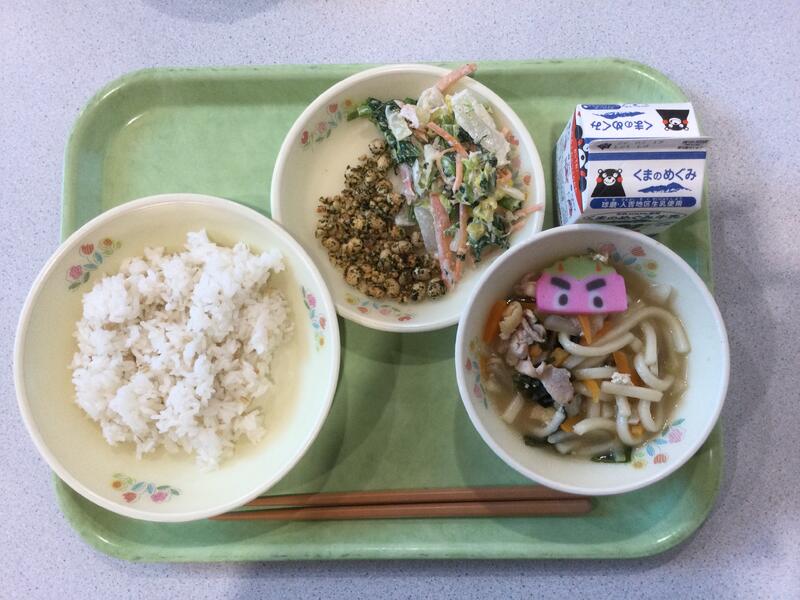 主食(麦ごはん)、牛乳、副食(とりにくのから揚げ、キャベツのごま昆布、うどん汁) |