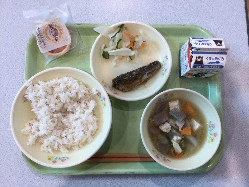 主食(麦ごはん)、牛乳、副食(いわしの梅煮、大根のゆず香あえ、さつま汁・焼きプリンタルト) |