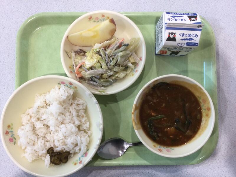 主食(麦ごはん・きゅうりの佃煮)、牛乳、副食(チキンカレー、カミカミサラダ、りんご) |