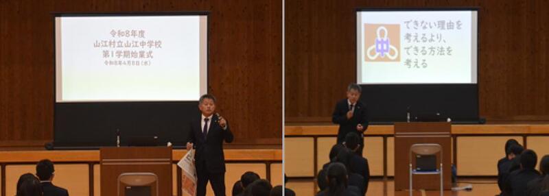 始業式では、村本校長先生からこれからの山江中学校が進むべき道、そして私たち全員が大切にしたい想いについてお話がありました。