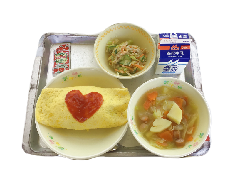 今日の給食:オムライス 牛乳 ごぼうサラダ 野菜のスープ煮