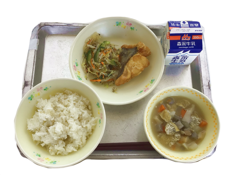 今日の給食(3月17日):麦ごはん 牛乳 ホキのかば焼き ゆかり和え のっぺい汁