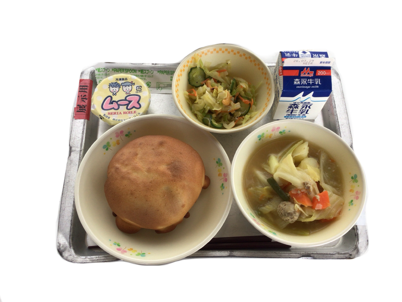 今日の給食(3月18日):UFOパン 牛乳 肉団子と野菜の煮込み かみかみチーズサラダ ムース