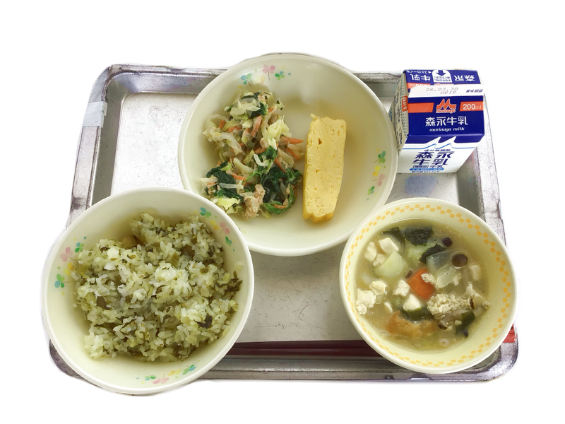 今日の給食(3月19日):高菜めし 牛乳 厚焼き卵 野菜のツナマヨあえ 具だくさんみそ汁