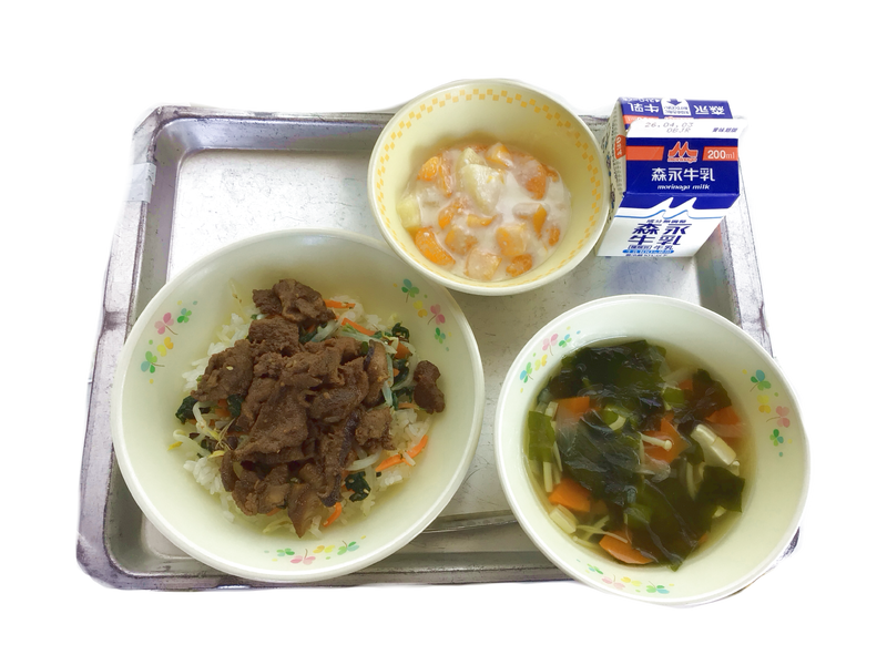 今日の給食:ビビンバ 牛乳 わかめスープ フルーツヨーグルト