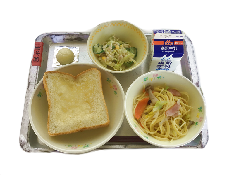 今日の給食:はちみつレモントースト 牛乳 春キャベツのスパゲッティ ツナマヨサラダ チーズ