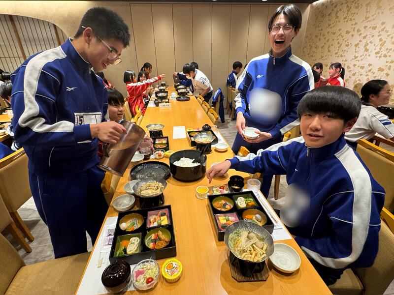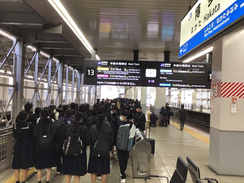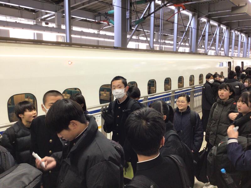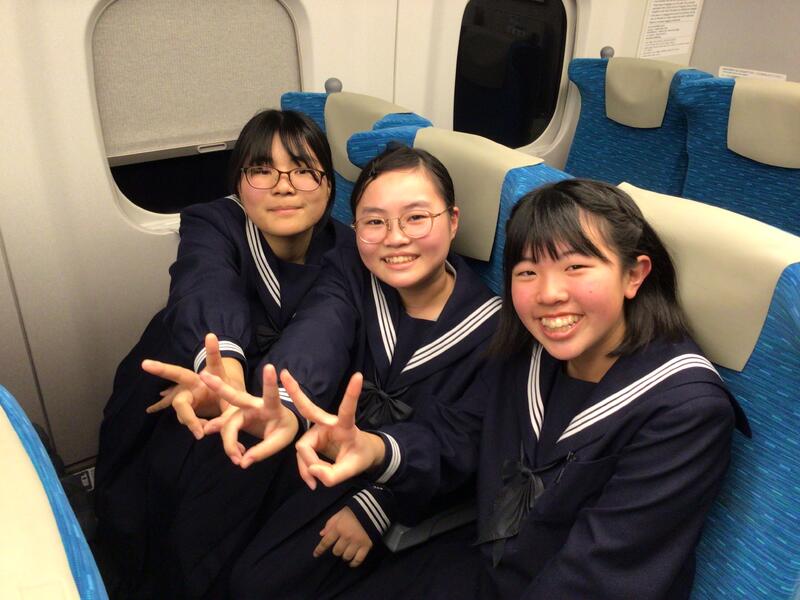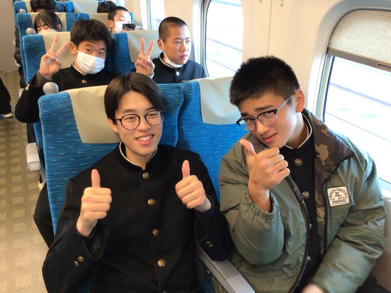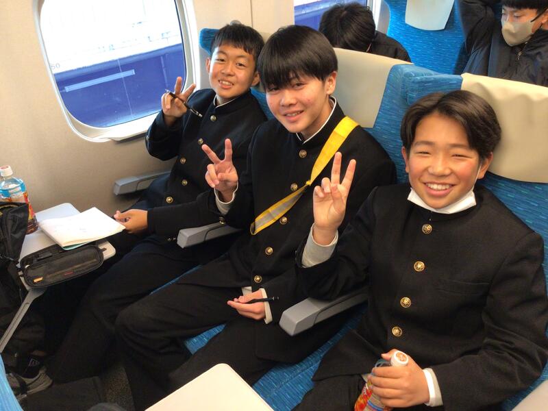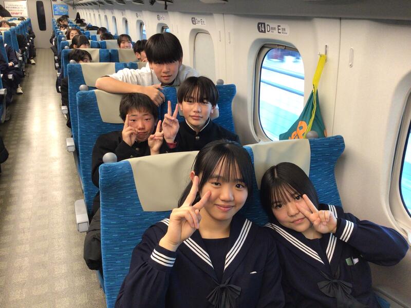 今新幹線に乗っています。周りからは、「初めて新幹線に乗った」、「弁当早く食べたい」の声が聞こえてきます。これから弁当を食べるので僕も楽しみです。3日間を楽しい思い出にできるよう自由行動では楽しく、学ぶとこではきっちり学んで満喫しようと思います。(生徒作成)