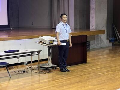 ( ↓ ※当日の様子:生徒会発表、教頭による説明の様子)