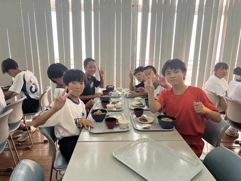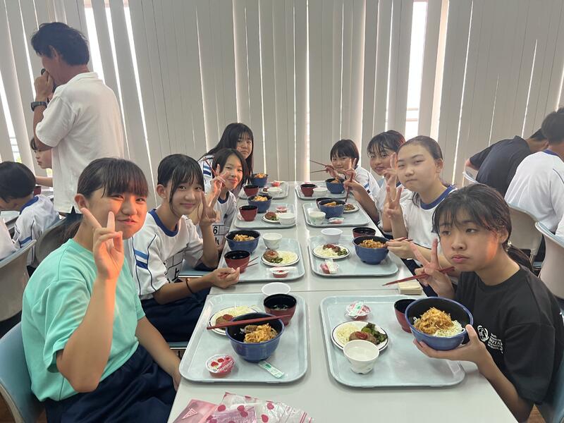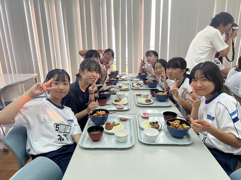 代表生徒の嶋田さんは「新米の香りがして、とてもおいしいです。」永田さんは「もっちりしていて、食べやすいです。」と感想を添えて感謝の言葉を発表しました。その後は、教室で一緒に給食を囲み、和やかな交流の時間となりました。