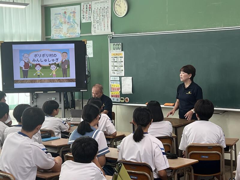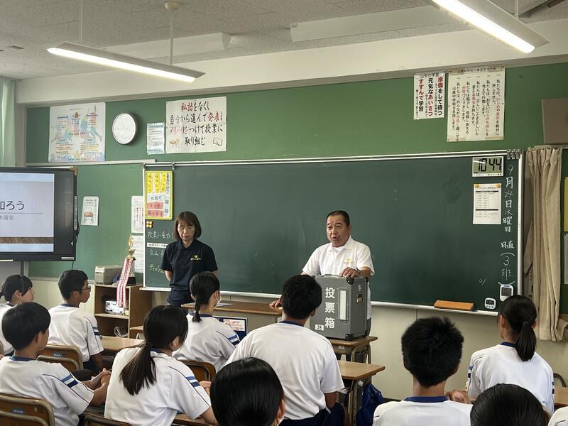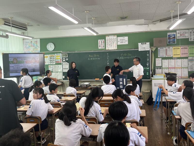 当日は、市議会議員20名を講師にお迎えし、各教室に分かれて授業を実施。市議会の役割や議員の仕事、選挙の大切さについてわかりやすく説明していただきました。また、教材を用いた模擬投票では、実際の投票手順を体験し、自分の一票が地域の未来に影響を与えることを学ぶことができました。