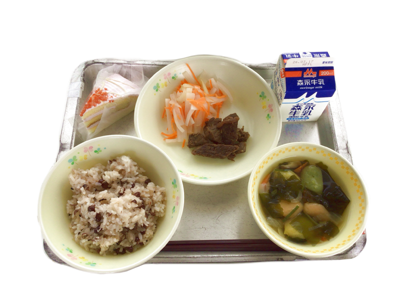 今日の給食:赤飯 牛乳 サイコロステーキ 紅白なます お野菜つみれ汁 お祝いケーキ