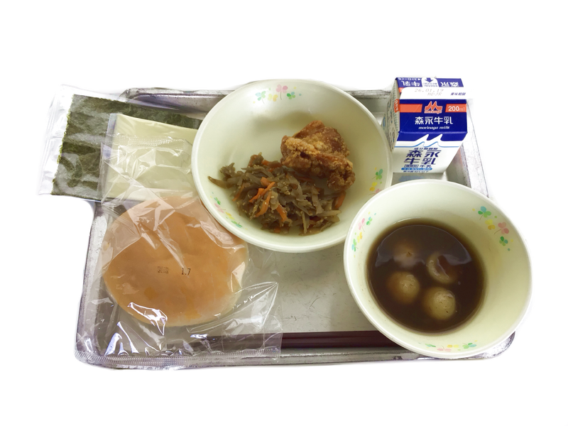 今日の給食:食パン 牛乳 かき揚げうどん ツナサラダ みかんジャム
